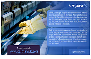 Cada vez mais a empresa vem investindo em equipamentos de alta tecnologia e se modernizando no ramo de corte e dobra de chapas aumentando sua capacidade produtiva com qualidade, precisão e rapidez.Contando com profissionais altamente qualificados, a Aços Triângulo é uma empresa séria, sólida e preocupada com a qualidade total em produtos e serviços disponibilizados aos seus clientes.