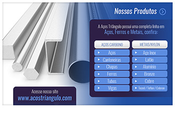 Desde 2012 a Aços Triângulo atua com excelência no mercado de ferros, aços e metais em Uberlândia-MG e região, fornecendo produtos de alta qualidade tais como: aços (trefilados, especiais, forjados), cantoneiras, chapas, ferros, tubos, vigas laminadas, aço inox, latão, alumínio, bronze, cobre, tecnil, teflon, celeron, plásticos industriais, e muito mais.
